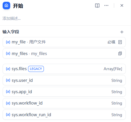 - 添加一个开始节点,同时在其中声明用户需要开始的时候上传的文档