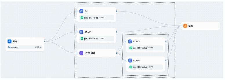 嵌套并行指的是 开始|多个并行结构|结束这样的关系,适用于内部较为复杂的工作流,比如一边进行多语言翻译,一边进行搜索,将搜索的结果传递给LLM。